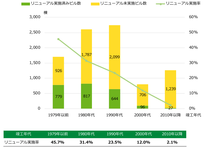 図表からは、築年数の古いビルほどリニューアル実施率が高い傾向が確認できる。