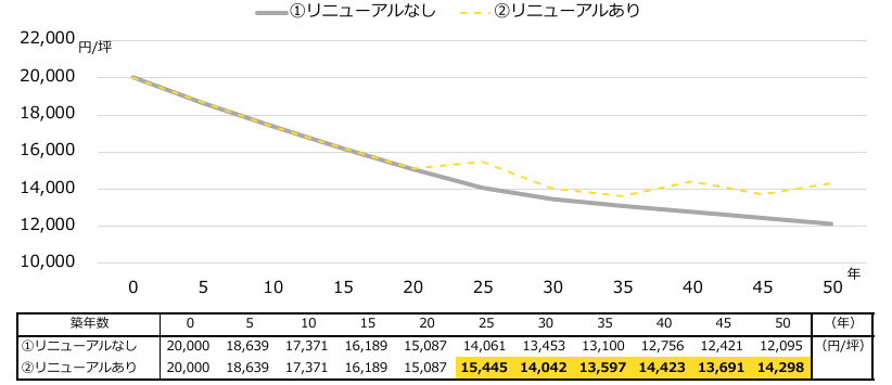 これらの結果を踏まえ、築年数とリニューアルの有無を考慮したうえで、新築から5年ごとの賃料推移を推計する。新築時点の賃料が20,000円/坪としたモデルケースを設定し、①リニューアルなし、②リニューアルあり(築21年時点と築36年時点にリニューアル実施を想定)の2ケースの賃料を推計した結果を示す【図表6】。