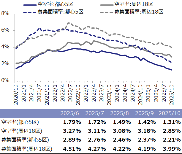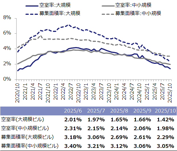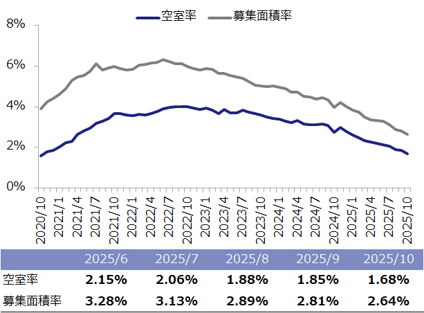 2025年10月期の空室率は、1.68%と前月と比べ0.17pt下落した。募集面積率は2.64%と前月と比べ0.17pt下落した【図表1】。