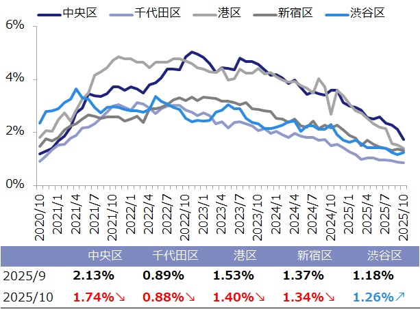 都心5区別の空室率は、中央区が1.74%と最も高く、千代田区が0.88%と最も低かった。渋谷区は前月から上昇、中央区、千代田区、港区、新宿区は下落した【図表2】。