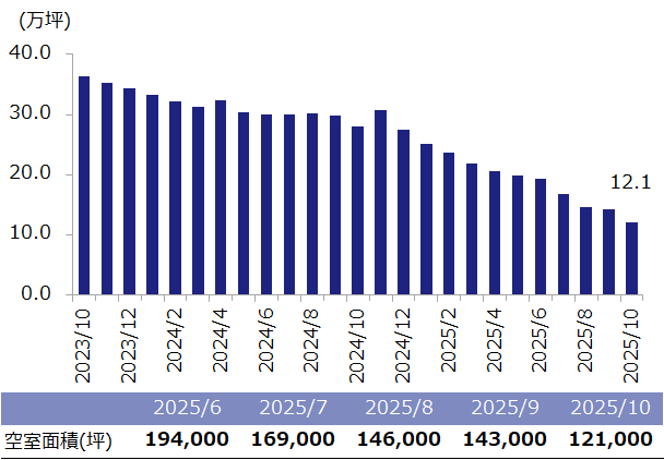 空室面積は12.1万坪と、前月と比べ2.2万坪減少した【図表3】。