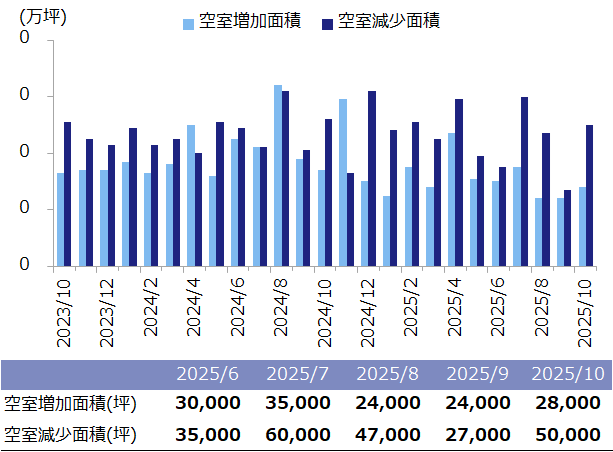 空室増減量は、増加が2.8万坪、減少が5.0万坪と、減少が増加を上回った【図表4】。