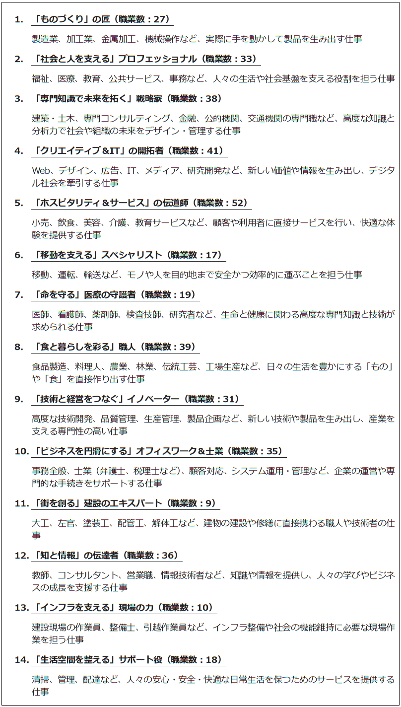前章で説明したクラスター分析により、現在の全職業を14に分類した。それぞれのクラスターごとの全体的な特徴、主な職業のカテゴリ、および具体的な職業名は以下のとおりである。各クラスターの名称は、それぞれの特徴を表すようなネーミングを当方でつけた。各クラスターごとの詳細な仕事の特徴については、別添の「資料編」を参照されたい。