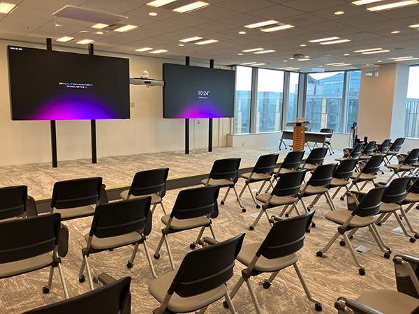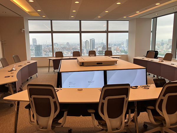 その“働きやすさ”の一つに、会議や商談におけるコミュニケーションのしやすさがあげられる。会議室に導入された自社製品の高機能会議デバイスは、AIが映像の明るさや距離感を調整し発話者に自動でフォーカスする。室内のどこで話しても音声が最適化され、リモートでもリアルでも臨場感のある会議が実現する。また、ワークショップやセミナーなどを通して顧客に実際に会議体験してもらうことを意識し、大会議室やマルチに使えるスペースを多めに用意している。ここにも各種製品が導入されており、テクノロジーで働きやすさを支えることを体現する場として、顧客向けのショーケースの役割も果たしている。