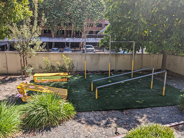 歩行者のためのストリートファニチャーや健康遊具が豊富に設置されている。(撮影:樋野夏希)