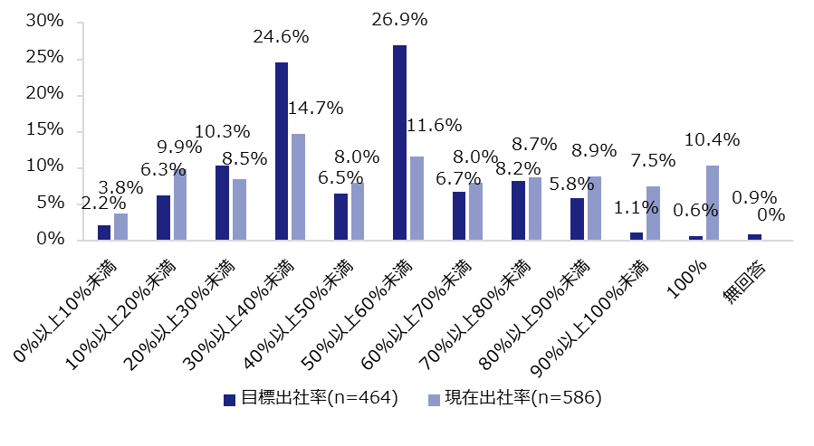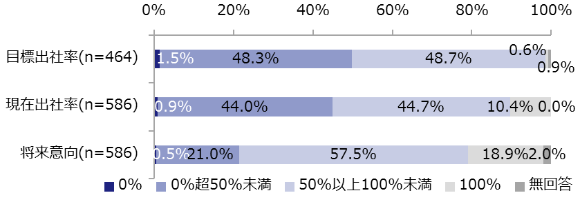 - ・ 目標出社率と現在の出社率は、どちらも4割以上が50%未満となっている一方、将来的な意向は8割近くが出社率50%以上となっている。