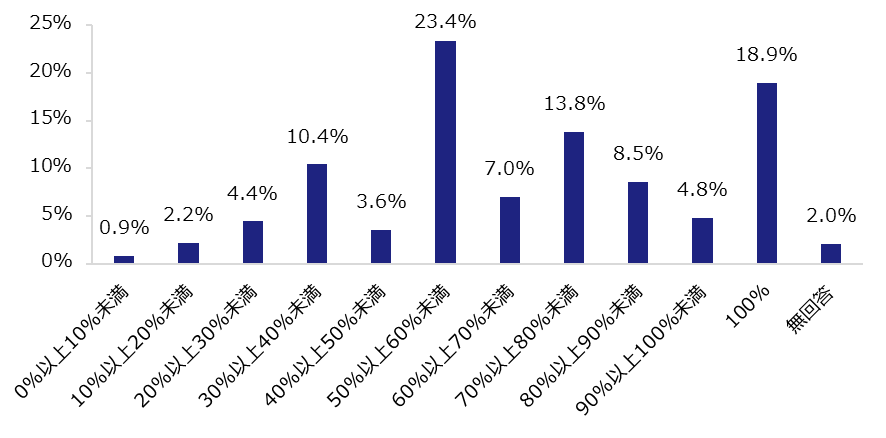 さらに内訳を10%単位で細かくみたところ、目標出社率は「30%以上40%未満」(24.6%)と「50%以上60%未満」(26.9%)が突出しているものの、どの区分でも現在出社率と差がみられ、目標と実態に乖離がみられることが分かった【図表3】。将来意向は「50%以上60%未満」(23.4%)が最も多く、全体の約1/4がコロナ危機収束後は出社率を半分にしたいと考えていることが分かった【図表4】。一方で、「100%」(18.9%)と、完全出社に戻す意向を示した企業もあった。