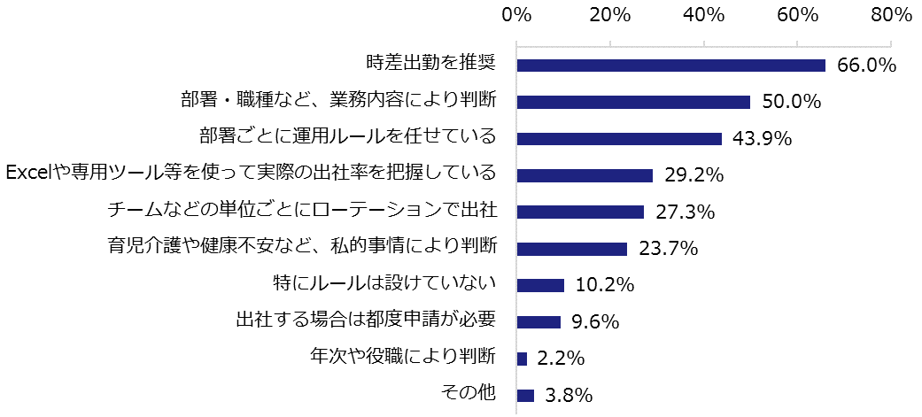 - ・ 出社に関するルールは、「時差出勤を推奨」(66.0%)が最も多く、次いで「部署・職種など、業務内容により判断」(50.0%)、「部署ごとに運用ルールを任せている」(43.9%)となった。