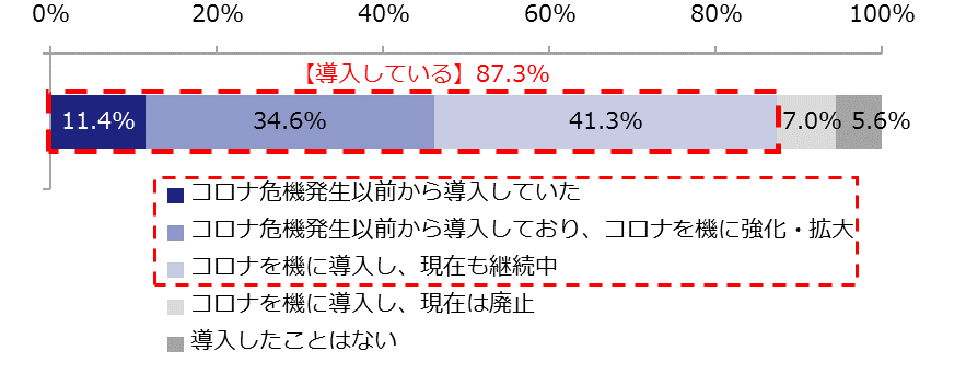 在宅勤務の状況についてたずねたところ、「コロナ危機発生以前から導入していた」(11.4%)、「コロナ危機発生以前から導入しており、コロナを機に強化・拡大」(34.6%)、「コロナを機に導入し、現在も継続中」(41.3%)と、9割近くが在宅勤務を現在に至るまで継続して行っている【図表7】。また、コロナを機に導入、またはコロナを機に強化・拡大した企業が全体の7割以上を占めており、コロナ危機が在宅勤務の普及の後押しをしたことがみてとれる。