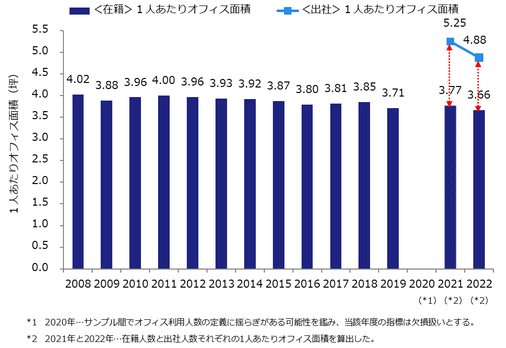 【図表2】<在籍/出社>1人あたりオフィス面積の推移(2008~2022、東京23区)