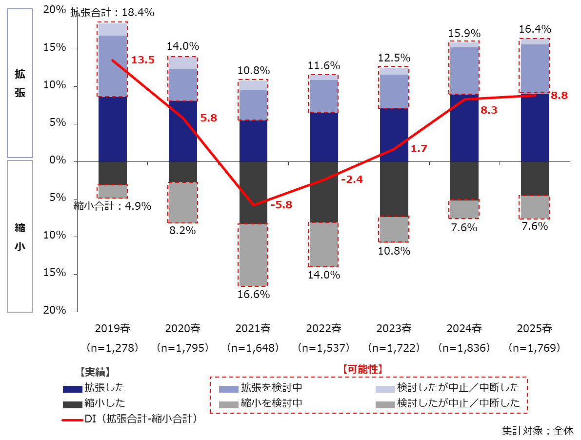 過去1年間のオフィス面積について「拡張(した+する可能性)」の合計は16.4%、「縮小(した+する可能性)」の割合は7.6%であった【図表1】。また、DIは8.8と2024春調査から微増している。