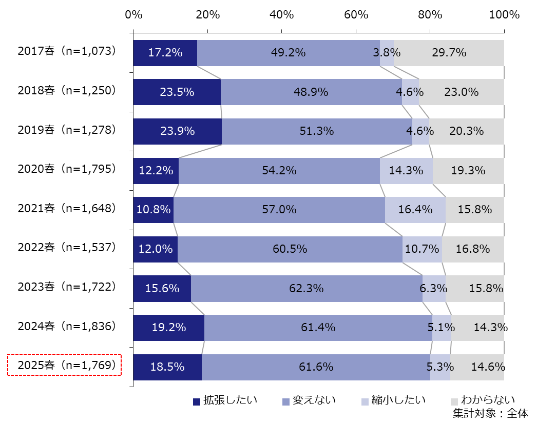 2021春調査を潮目に縮小トレンドから拡張トレンドへの転換が進み、直近では拡張トレンドで安定しつつあることがみてとれる。