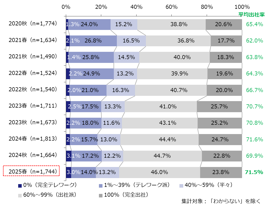 出社率は、新型コロナウイルス感染症の5類移行後(2023春調査以降)は概ね横ばいで、平均出社率が7割前後の状況が続いている【図表3】。ただし、「60%~99%(出社派)」は2023春調査から今回調査までで計5.0ポイント増加し「1%~39%(テレワーク派)」が計3.5ポイント減少するなど、内訳にはやや変化がみられる。