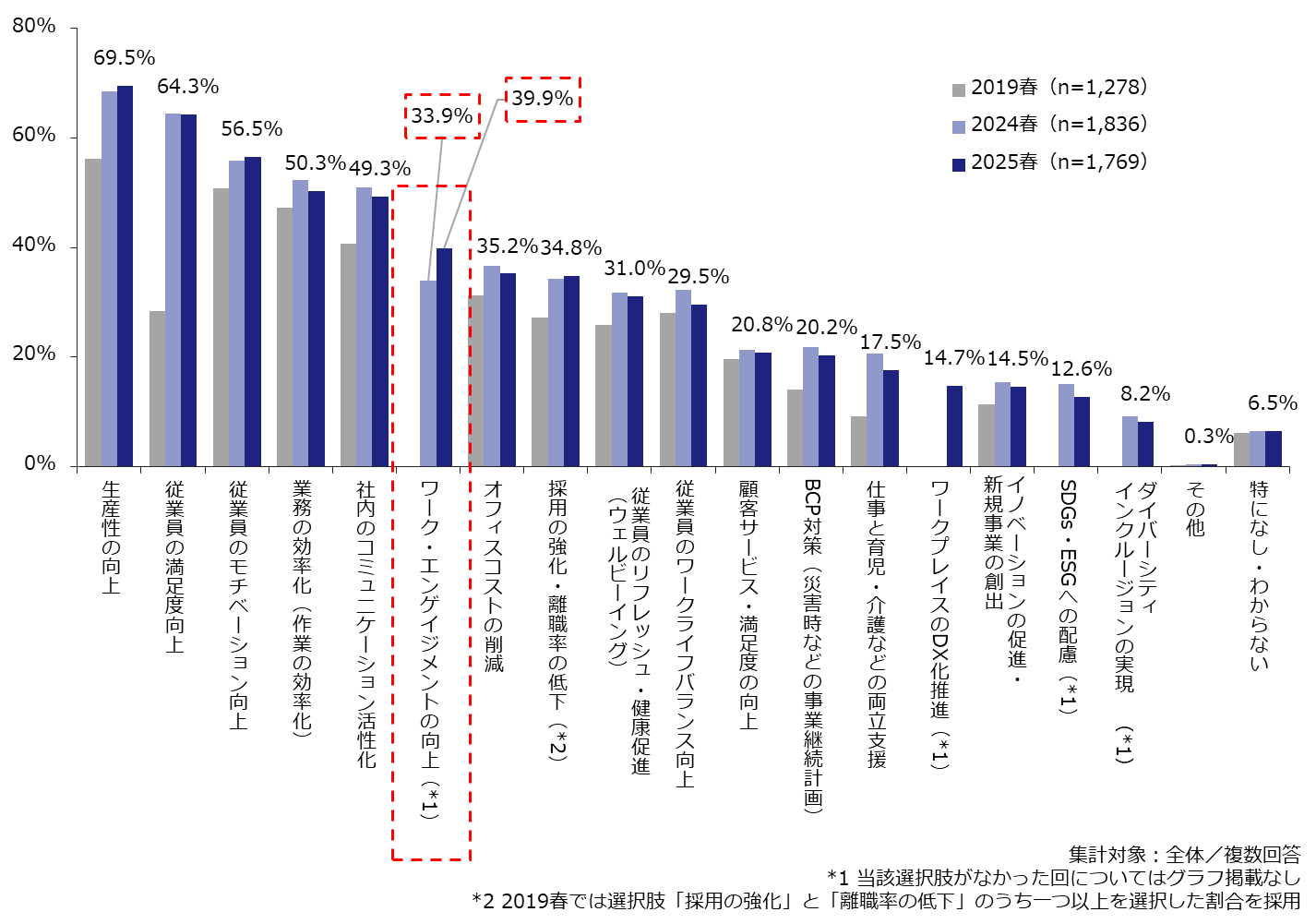 - ・ オフィス施策を実施するうえで重視すること:2019春調査と比較すると2024春調査と同様にすべての項目で回答割合が増しており、オフィスに多様な要素が重視されるようになった状況が継続している。「ワーク・エンゲイジメントの向上」では2024春調査からさらに6.0ポイント伸びており、直近でさらに重視度が増している【図表4】。