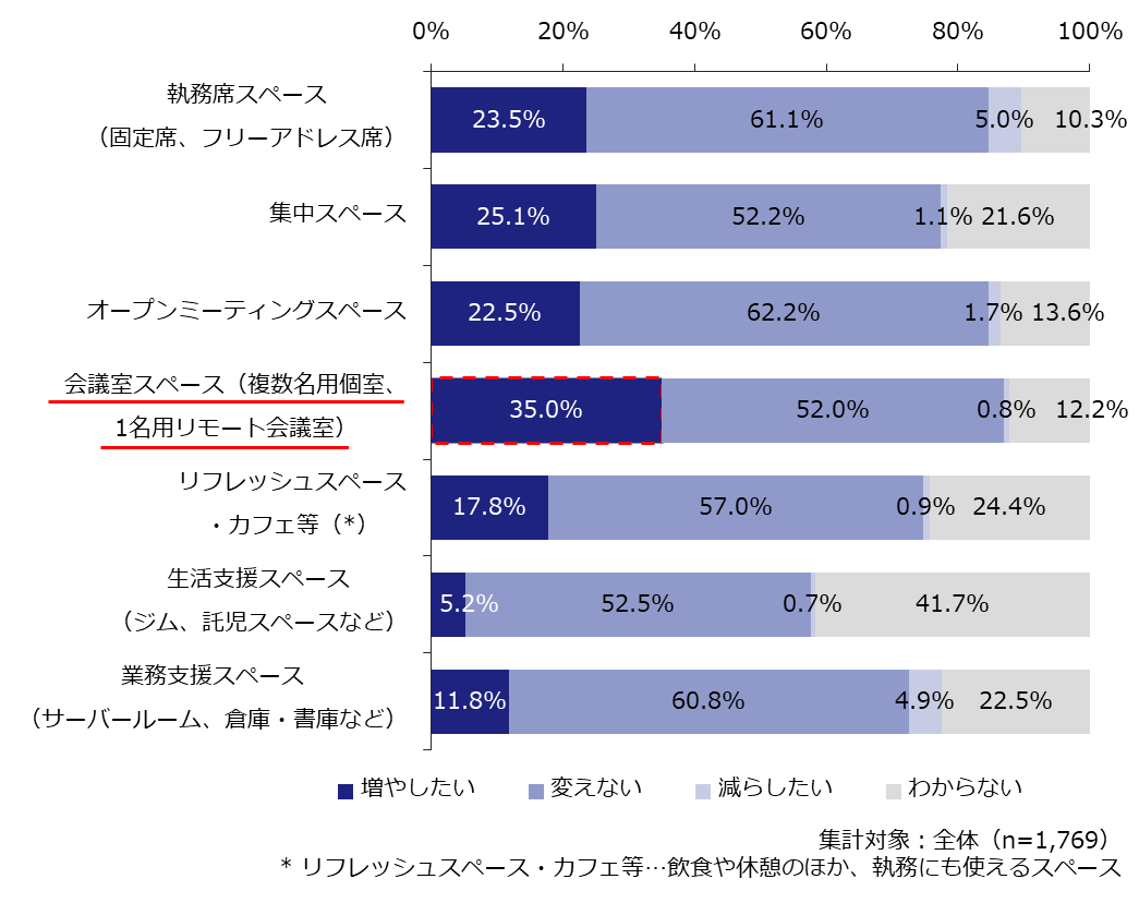 - ・ 今後の各スペースの変化:「増やしたい」と回答した割合が最も高かったスペースは「会議室スペース(複数名用個室、1名用リモート会議室)」(35.0%)【図表5-2】。