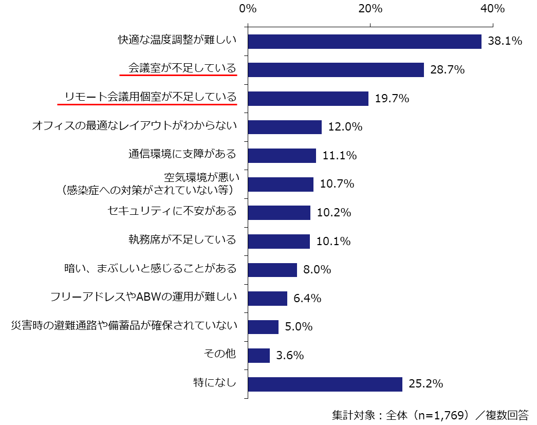 - ・ メインオフィスについて課題に感じていること:「快適な温度調整が難しい」(38.1%)が1位。次いで「会議室が不足している」(28.7%)や「リモート会議用個室が不足している」(19.7%)【図表5-1】。