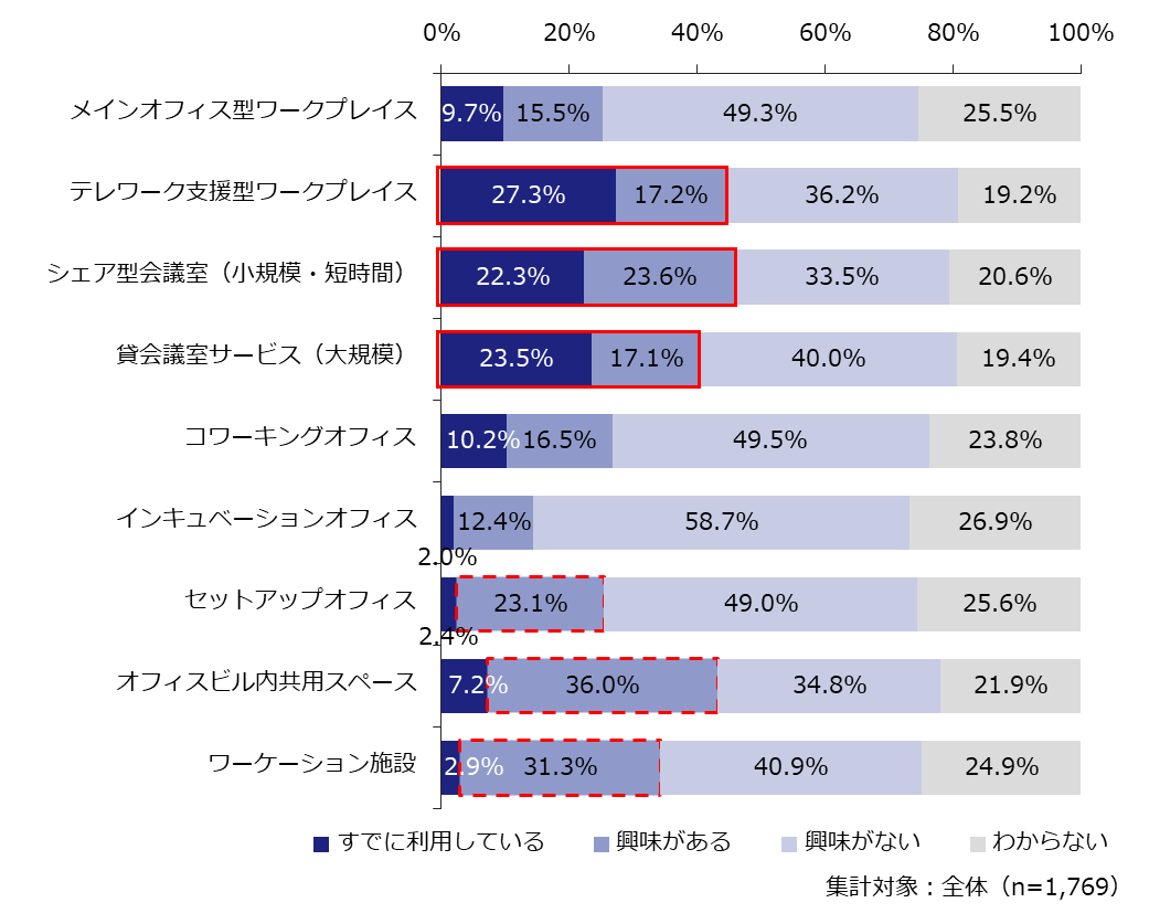 「セットアップオフィス」や「オフィスビル内共用スペース」「ワーケーション施設」では、「すでに利用している」割合こそ低いものの「興味がある」と回答した企業が目立った。