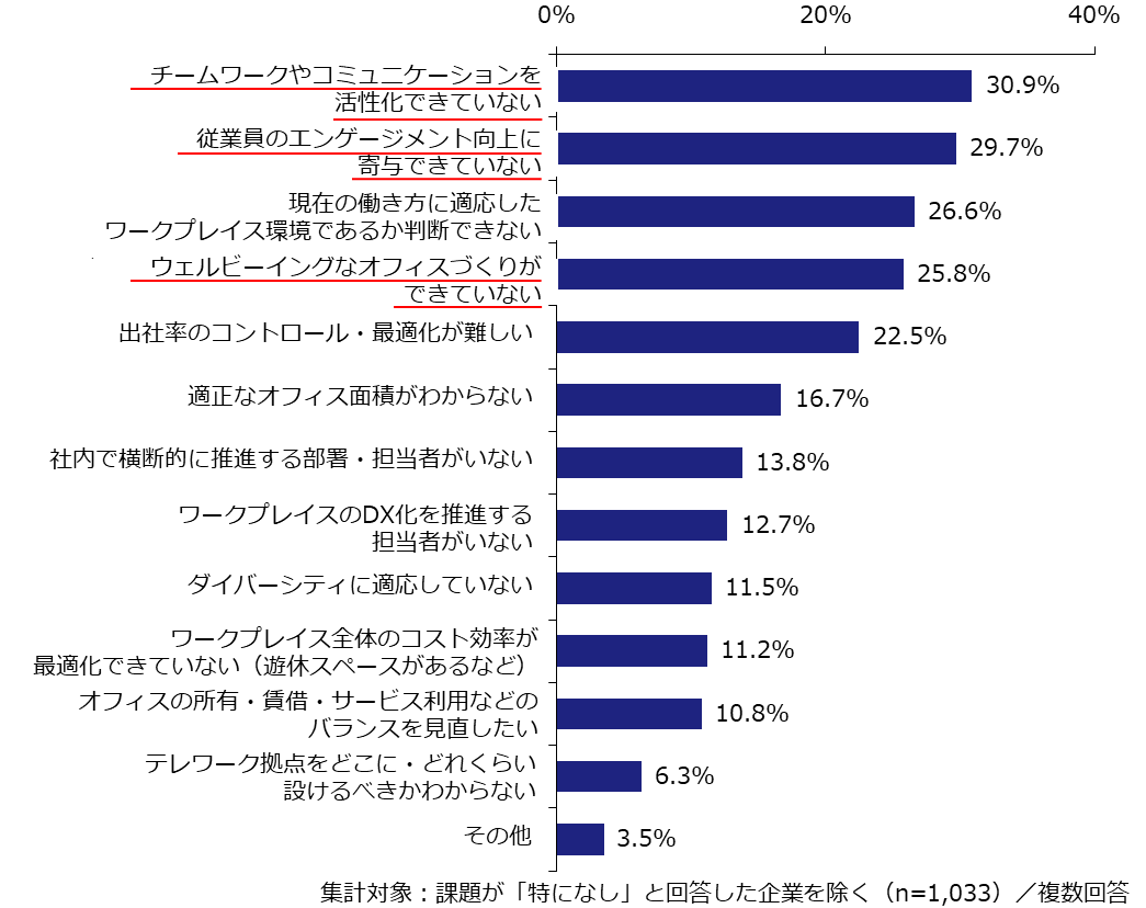 また、「現在の働き方に適応したワークプレイス環境であるか判断できない」(26.6%)、「出社率のコントロール・最適化が難しい」(22.5%)、「適正なオフィス面積がわからない」(16.7%)といった、コロナ禍以降の働き方の変化への対応を課題として挙げる企業も一定数いることがわかる。