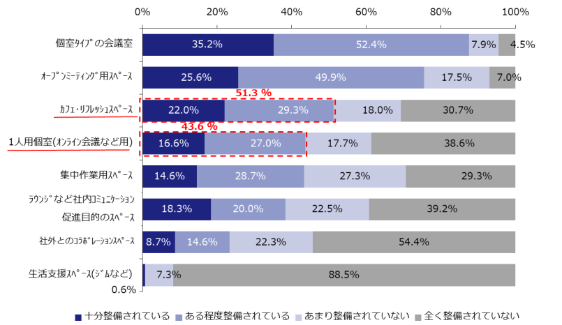 また、「1人用個室(オンライン会議など用)」も43.6%が整備済みと回答しており、オンライン会議の普及に対応した個室環境が一定程度整っていることがうかがえる。