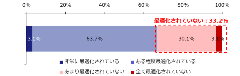 現在のオフィス利用状況に対する評価をたずねると、「あまり最適化されていない」「全く最適化されていない」と回答した企業が33.2%であり、約3分の1の企業で改善の余地が残されている【図表2-1】。