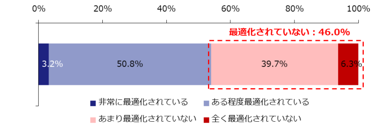 自社ビルでオフィスを構える企業に限定してみると、最適化されていないと回答した割合は46.0%にのぼる【図表2-2】。自社ビルの場合、レイアウト変更やスペース再構成などの自由度が高いと考えられるが、実際には十分に活かされていない企業が多い。