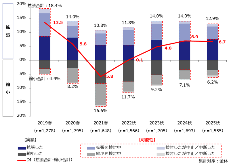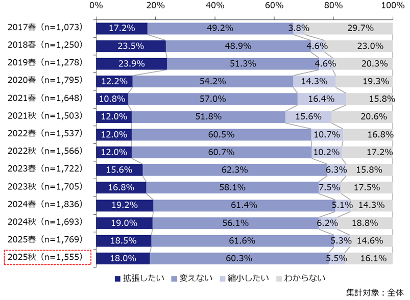 経年では2021春調査を底に「拡張したい」が増加傾向であったが、コロナ禍以前(2019春調査以前)の水準までは戻らず、横ばいで推移している。