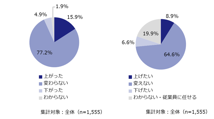 1年前と比べた出社率の変化では、「変わらない」が77.2%と最多であった【図表3-2(左)】。2023年5月の新型コロナウイルス感染症の5類移行から2年以上が経過し、足元では出社率が安定している様子がうかがえる。今後の出社率の意向についても、「変えない」(64.6%)が大半を占めており【図表3-2(右)】、当面は現状維持の姿勢が主流といえそうだ。