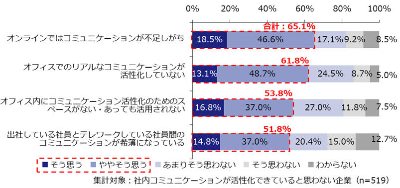 - ・ 社内コミュニケーション(リアル/オンライン問わず)を活性化できていると思うかを聞いた結果、約6割が「(やや)そう思う」と回答した一方、33.4%は「(あまり)そう思わない」と回答した【図表6-1】。具体的な課題では「オンラインではコミュニケーションが不足しがち」(65.1%)が最も高かった。【図表6-2】。