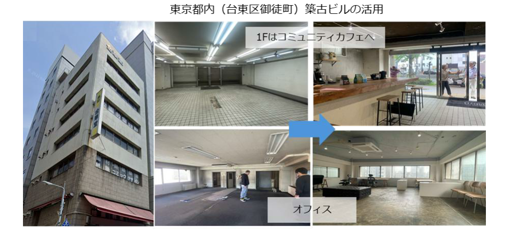 東京都台東区の御徒町では、運営方針に迷っていたビル(延床面積200坪)に対し、サブリース契約を締結し、老朽化した設備を効率的に更新した。具体的には、給排水管を外部に刷新し、低圧2回線を引き込み電気容量を確保し、その結果、1階にカフェ、上階にオフィスを配置する複合利用型の再生モデルを実現した。