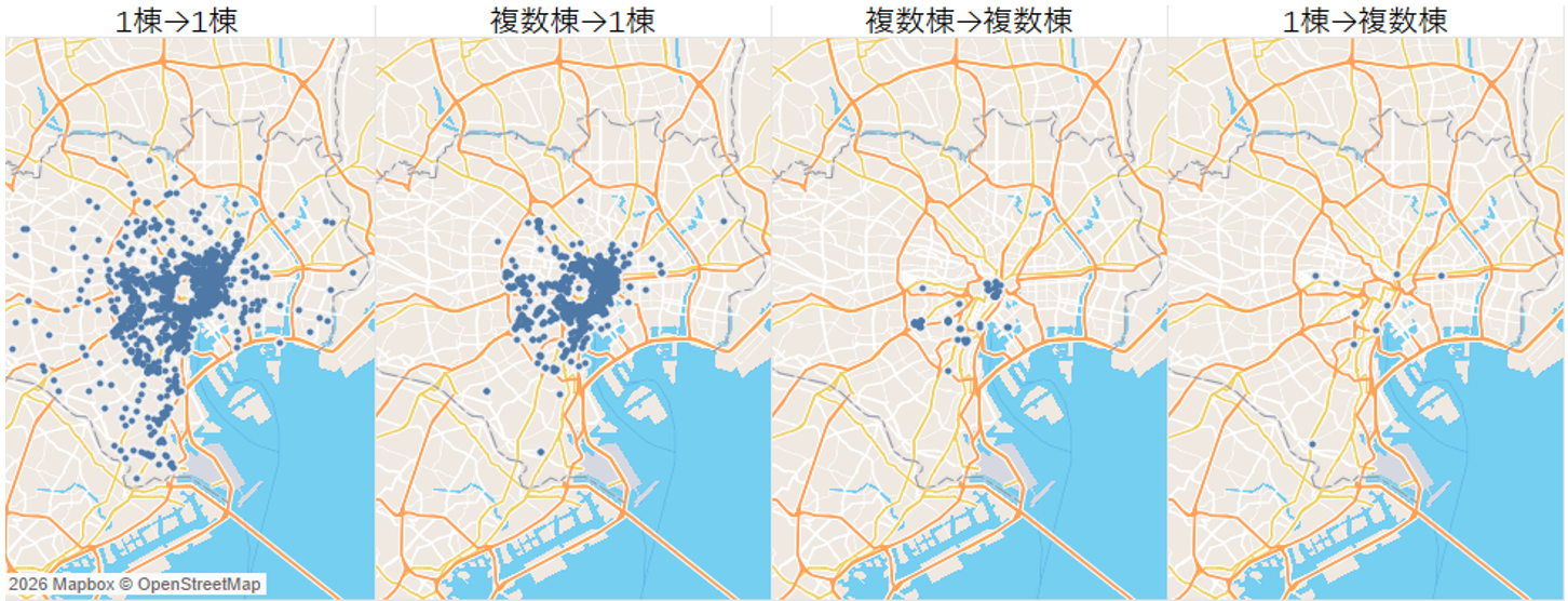用途だけでなく、建て替え前後で敷地内の棟数構成がどのように変化したかについても整理した。具体的には、取り壊し物件ごとに、取り壊し前に同一敷地内に存在していた建物棟数と、取り壊し後に同一敷地内で新たに建設された建物棟数を把握し、その組み合わせに基づいて棟数構成の変化を以下のように定義した。
