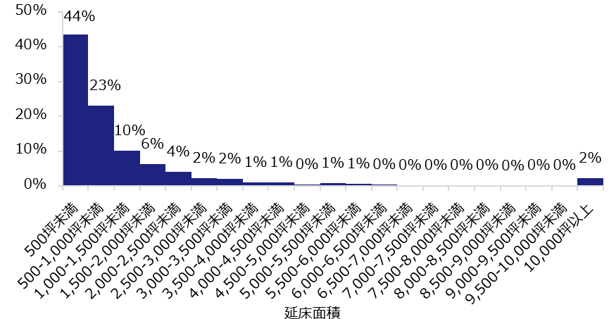次に、取り壊し物件がどの程度の規模の建物だったのかを把握するため、延床面積の分布をヒストグラムとして【図表2】に示す。取り壊されたオフィスビルは、延床面積500坪未満が4割強、500~5,000坪未満の中規模ビルが約5割を占める。すなわち、全体の大半は延床面積5,000坪未満の中小規模ビルである。