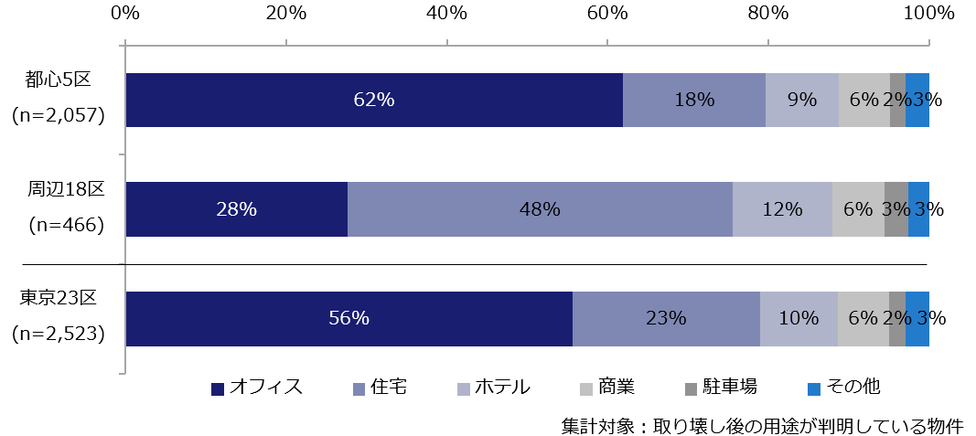 - 都心5区では「オフィス→オフィス」への建て替えが主流であるのに対し、周辺18区では「オフィス→住宅」への建て替えが約半数を占める。