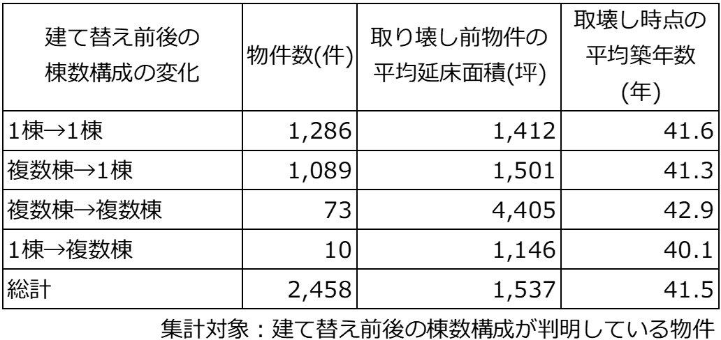 棟数構成の変化は、「1棟→1棟」と「複数棟→1棟」のケースがほとんどである。「複数棟→複数棟」の建て替えでは、取り壊し前の平均延床面積が他のパターンと比べて大きいが、一部の大規模物件が平均値を押し上げている可能性がある点には留意が必要である。そのほか、いずれのパターンも取り壊し前の平均延床面積や築年数に差はみられなかった。
