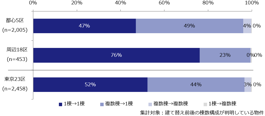 都心5区では、「1棟→1棟」の建て替えと「複数棟→1棟」の建て替えがほぼ半々となる一方、周辺18区では「1棟→1棟」の建て替えが8割弱を占めた。