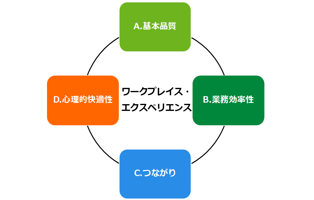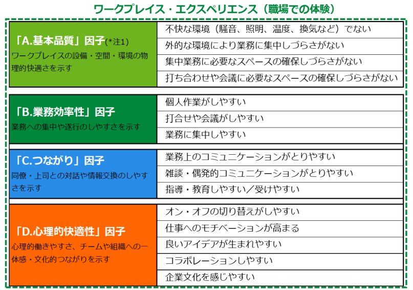 - ワークプレイスの設備・空間・環境の物理的快適さを示す「A.基本品質」因子(※注1)