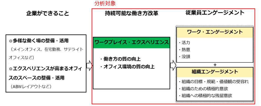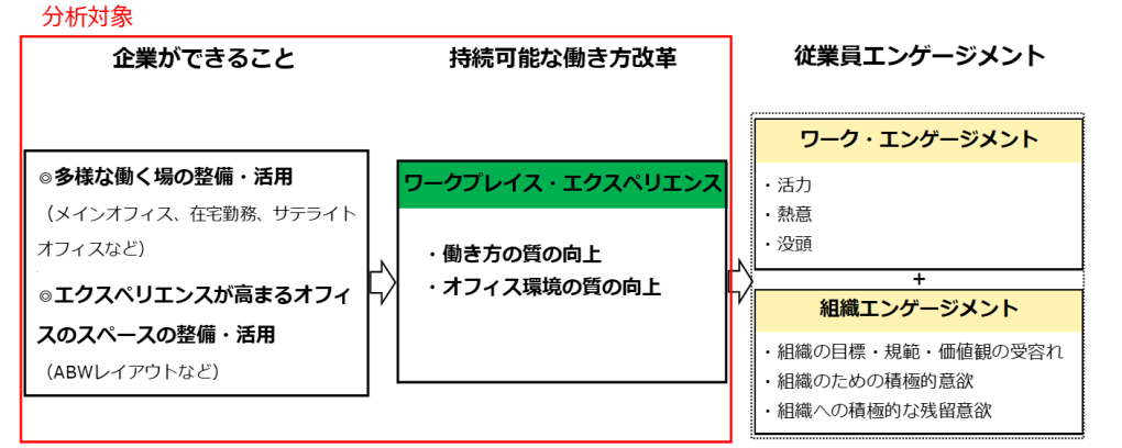 次に、ワークプレイス・エクスペリエンスが従業員エンゲージメントにどのような影響を与えているのかを確認する(分析対象は下図の赤枠部分を参照)。