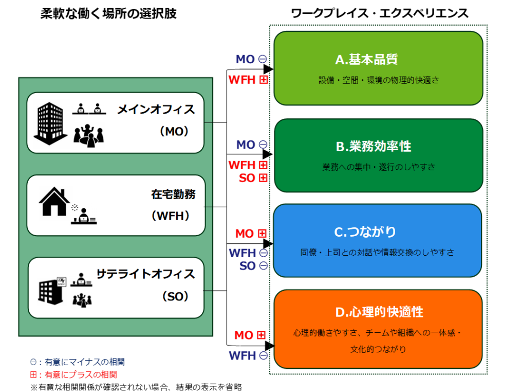 一方で、在宅勤務頻度が高いほど「C.つながり」「D.心理的快適性」が低下しやすい傾向がみられた。対面でのコミュニケーション機会が限られることが、これらの傾向と関連している可能性が考えられる。 - サテライトオフィス:「B.業務効率性」と有意に正の関連が見られ、メインオフィスと自宅(在宅勤務)を補完する生産的な場所として機能することが示唆された。