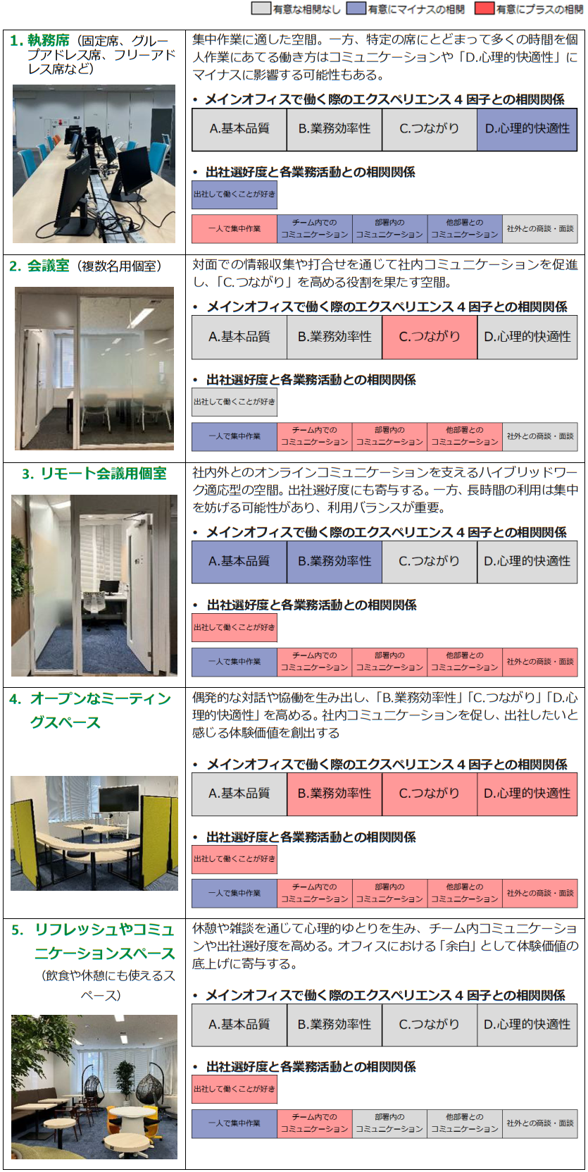 分析の結果、各スペースはそれぞれ異なる役割を担い、特有の体験価値を提供していることが示された。また、「執務席」や「会議室」は日常業務を支える基盤的な空間である一方、「リモート会議用個室」「オープンなミーティングスペース」「リフレッシュ・コミュニケーションスペース」は「来たくなるオフィスづくり」にプラスに寄与する重要な要素であることが示唆された。