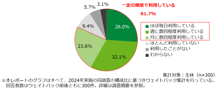 まず、普段の生成AIの利用状況を聞いた結果、「ほぼ毎日利用している」「週に数回程度利用している」「月に数回程度利用している」のいずれかと回答した割合は合計81.7%となった【図表1】。現代の就活生は、仕事に就く以前から生成AIを日常的に利用している世代であるといえる。