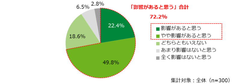 次に、就職後、DX化(生成AI活用やロボット導入など)による自身の仕事やキャリアへの影響があると思うかを聞いた。その結果、「(やや)影響があると思う」と回答した割合は合計72.2%で、「(あまり)影響はないと思う」(合計9.3%)を大きく上回った【図表2】。就活生の大多数は、仕事に就く以前から、社会変化による自身のキャリアの予測困難さを感じているといえるだろう。