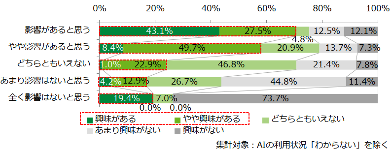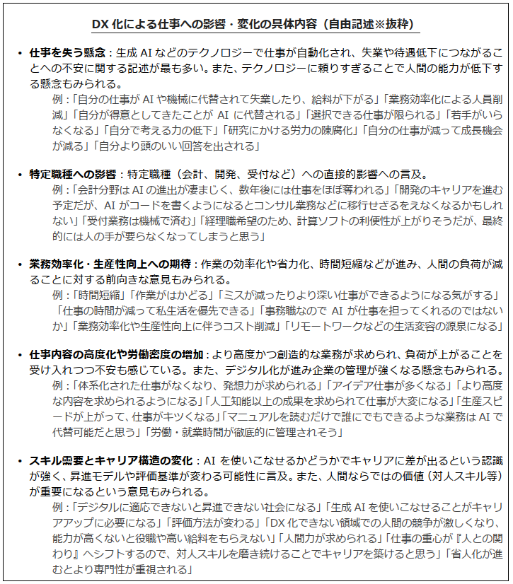 【図表2】で「(やや)影響があると思う」と回答した人に対して、その具体的な内容を自由記述で聞いたところ、いくつかのタイプが確認された。最も件数が多かったのは、テクノロジーによる失業への懸念である。今回の調査では、就職活動における志望業界・職種は把握していないものの、日本の雇用慣行を踏まえると、調査対象者の多くはデスクワーク職に就くことを想定していると考えられる。そのため、デジタル技術の進展による将来の労働需要の変化に対し、強い危機感を抱いている様子がうかがえる。