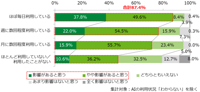 DX化による自身の仕事やキャリアへの影響について、【図表1】でみた生成AIの利用状況別に比較すると、利用頻度が高い層ほど「(やや)影響があると思う」の回答割合が高いことがわかった【図表3】。生成AIを「ほぼ毎日利用している」と回答したグループでは合計87.4%に上り、「ほぼ利用していない/利用したことがない」グループ(46.8%)とは大きな差がみられた。