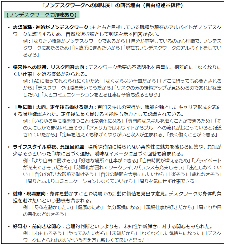次に、ノンデスクワーク就業への興味の背景にある価値観を探るため、「ノンデスクワークへの興味度」の回答理由を自由記述で聞き、その内容を確認した。