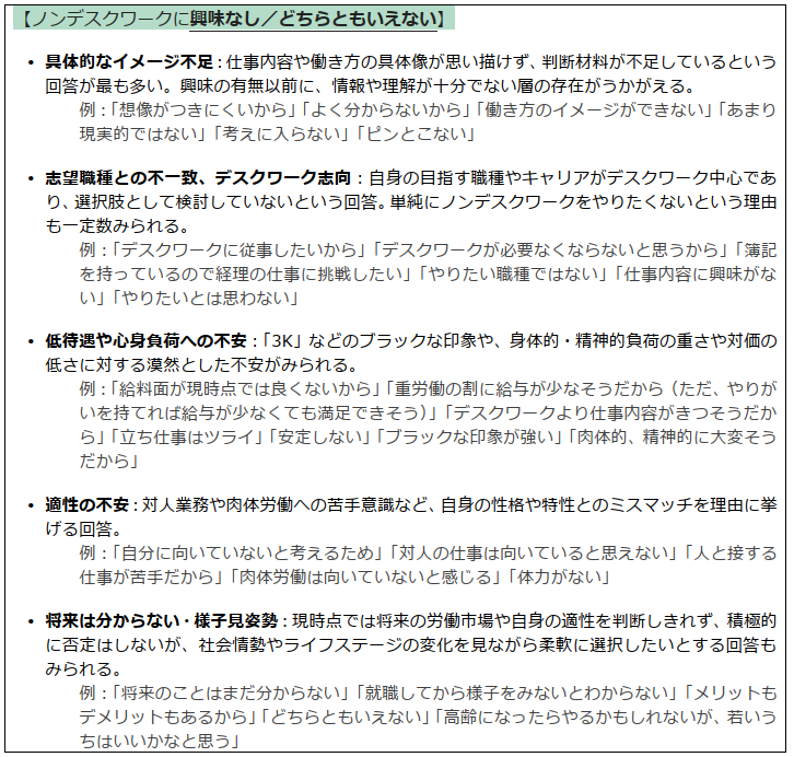 回答をノンデスクワークへの興味の有無別にみると、「興味あり」のグループでは、もともとノンデスクワークを志望している、アルバイト経験があるといった理由から、ノンデスクワークで働くことに対して具体的なイメージを持っていることを示す回答が多くみられた。一方、「興味なし」のグループでは、ノンデスクワークの仕事内容や働き方のイメージが湧かないことを理由とする回答が最も多かった。すなわち、ノンデスクワークに対して具体的な働くイメージを持てるか否かが、興味の有無を左右する一因となっている可能性が示唆される。以下に、タイプごとの代表的な回答例を記載する。