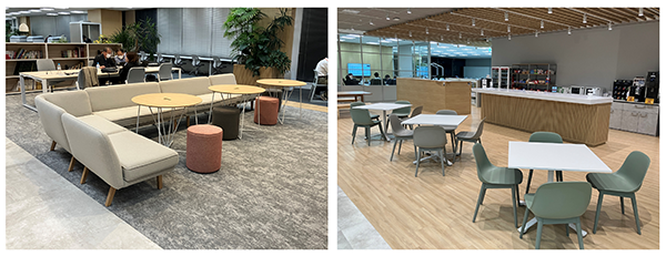 新しい働き方で2年以上を過ごすなかで、みえてきた課題に応じた改善も進めている。「たとえば、現オフィスへの移転当初は、オフィスはコミュニケーションの場ということを意識しすぎて、実際の働き方に対応できていなかったと思います。また、打合せは会議室でする、という習慣が根強く、オープンスペースに空きがあるにも関わらず『会議室が足りない』という声があがることもありました。秘匿性の高い内容でない限り、オープンスペースを積極的に活用してほしいと考えているので、敢えてソロワーク用のスペースを増設し、利用目的によってスペースを使い分けやすい環境を整えています」(丸山氏)。